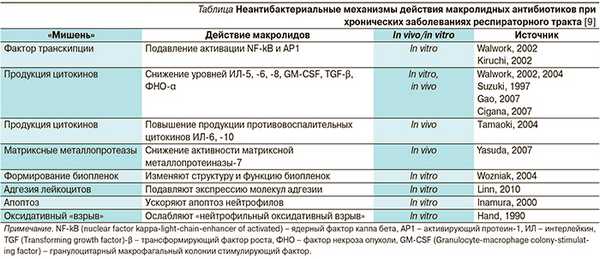 Неантибактериальные эффекты макролидов связаны с противовоспалительным и иммунотропным влиянием. Данные эффекты отмечены только у 14- и 15-членных макролидов (см. таблицу).