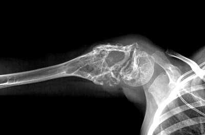 — Рентгенологическое исследование. Позволяет визуализировать тень опухоли, деформацию прилежащих к опухоли фасциальных перемычек, выявить изменения в костях;