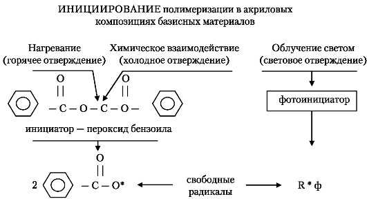 Зубные протезы из акриловых материалов изготавливают по технологии формования полимер-мономерной композиции или технологии «теста», согласно которой жидкий компонент (мономер, чаще всего метиловый эфир метакриловой кислоты или метилметакрилат), смешивается с порошкообразным компонентом (полимером). Мономер смачивает и пропитывает полимер до тестоподобной консистенции. Это тесто заформовывают или пакуют в гипсовую форму для изготовления протеза. Затем оно переходит в твердое состояние или отверждается в результате радикальной полимеризации, начало которой дает распад инициатора, пероксида бензоила, входящего в состав порошка, при нагревании тестообразной композиции (схема 13.1). Новые полимерные базисные материалы и новые технологии их применения расширили возможности получения первичного свободного радикала, добавив, например, способ светового отверждения.