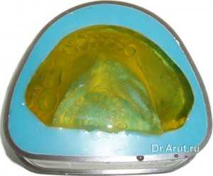 Прогревают форму с искусственными зубами и модель в термошкафу при температуре 120°С в течении 20 минут. Устанавливают в форму модель из полиуретана или же подготавливают модель из гипса и помещают её.