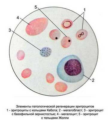 - в красных клетках крови замечаются остатки ядерной субстанции (включения в виде телец Жолли либо колец Кобота);