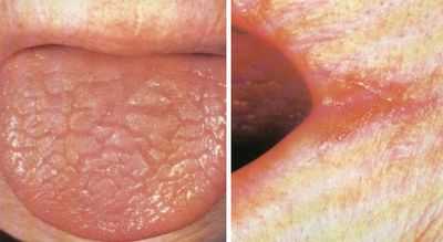 - В полости рта развиваются проблемы с характерными для глоссита признаками: сосочки атрофированы, поверхность языка - лакированная, язык распухает и болит;