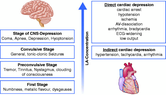 Токсичность МА проявляется в виде системного (воздействие на ЦНС и сердце) и локального токсического действия (прямое нейро-, миотоксическое; преходящие неврологические симптомы, аллергические реакции). Большие дозы повышают риск развития СТМА, в то же время высокие концентрации анестетика и длительное нахождение препарата в крови (в большей степени, чем общая доза) определяют прямой нейротоксический эффект.