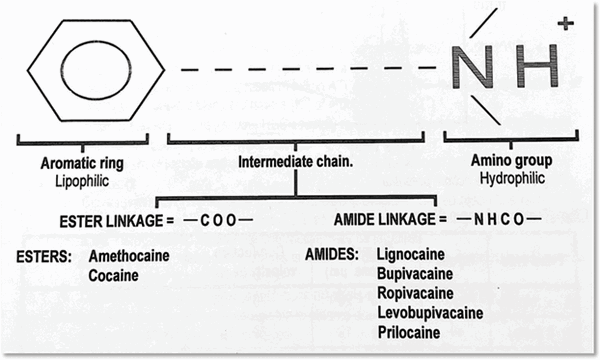 В зависимости от промежуточной цепочки все МА делят на 2 большие группы: сложные эфиры (кокаин, прокаин, тетракаин, бензокаин) и амиды (лидокаин, мепивакаин, бупивакаин, ропивакаин, этидокаин, артикаин) (рис. 3).