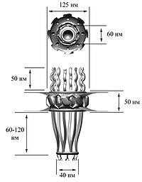 По данным электронной микроскопии, ядерные поры в поперечном сечении имеют форму «восьмиспицевого тележного колеса», то есть имеют ось симметрии восьмого порядка. Эти данные подтверждает тот факт, что молекулы нуклеопоринов присутствуют в составе ядерной поры в количестве, кратном восьми. Проницаемый для молекул канал располагается в центре структуры. Комплекс ядерной поры заякорен на ядерной оболочке с помощью трансмембранной части, от которой к просвету канала обращены структуры, получившие название спиц (англ., spokes), по аналогии со спицами тележного колеса. Эта коровая часть поры, построенная из восьми доменов, с цитоплазматической и ядерной сторон ограничена соответственно цитоплазматическим и ядерным кольцами (англ., rings; у низших эукариот они отсутствуют). К ядерному кольцу прикреплены белковые направленные внутрь ядра тяжи (ядерные филаменты, англ., filaments), к концам которых крепится терминальное кольцо (англ., terminal ring). Вся эта структура носит название ядерной корзины (англ., nuclear basket). К цитоплазматическому кольцу также прикреплены направленные в цитоплазму тяжи — цитоплазматические филаменты. В центре ядерной поры видна электрон-плотная частица, «втулка» или транспортер (англ., plug).