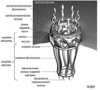 Ядерные поры — это не просто перфорации, а сложно устроенные, многофункциональные регулируемые структуры, организованные приблизительно 30 белками — нуклеопоринами. Белковая составляющая ядерной поры обозначается термином «комплекс ядерной поры» (англ., nuclear pore complex, NPC). Масса комплекса ядерной поры колеблется в пределах от ~44 МДа в клетках дрожжей до ~125 МДа у позвоночных.
