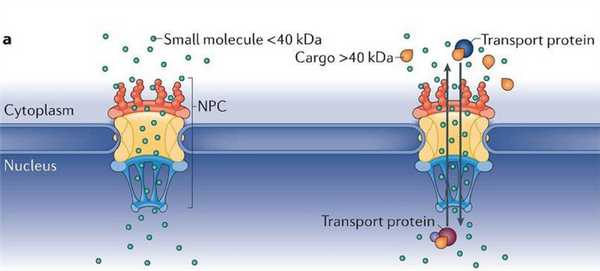 Молекулы небольших размеров (ионы, метаболиты, мононуклеотиды и т. д.) способны пассивно диффундировать в ядро. Проводимость ядерных пор для молекул разных размеров различна. Белки массой менее 15 кДа быстро проникают в ядро, в то время как для белка массой более 30 кДа на это требуется определенное время. Белковые молекулы массой более 60-70 кДа, по-видимому, вообще не могут пассивно проходить через ядерные поры. Впрочем, пропускная способность ядерных пор для пассивной диффузии может изменяться в зависимости от типа клетки и стадии клеточного цикла.