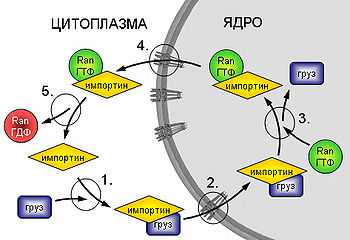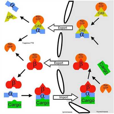При импорте какого-либо белка со стороны ядра к транспортному комплексу присоединяется уже неоднократно упоминаемая ГТФаза Ran, что необходимо для диссоциации импортина-β и высвобождения переносимого субстрата в кариолимфу (рис. 5, 6).