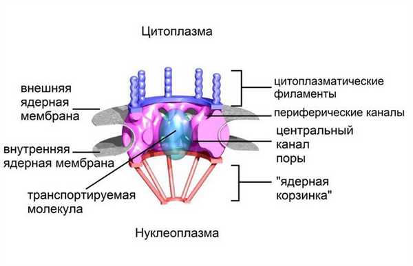 В состав одного комплекса ядерной поры входят различные виды нуклеопоринов (коих около 30-ти), скомпонованных в субкомплексы, каждый из которых представлен несколькими копиями, в результате чего полностью собранный NPC включает в себя от 500 до 1000 отдельных белков. NPC соединяют наружную и внутреннюю мембраны оболочки ядра, формируя при этом водные каналы. Благодаря методам криоэлектронной микроскопии и томографии стало возможным внимательное рассмотрение структуры ядерных пор: центральный канал каждой поры окружен тремя последовательно уходящими вглубь кольцевыми структурами, к которым как со стороны цитоплазмы, так и со стороны ядра прикрепляются белковые нити, что в совокупности по своему виду напоминает корзину (да собственно, так и называется — nuclear basket). Транспорт солей, нуклеотидов, небольших молекул и компонентов, требующихся для синтеза ДНК и РНК, осуществляется через NPC путем пассивной диффузии (рис. 3).
