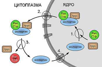 Экспортины связываются с ГТФазой Ran и экспортируемым белком в ядре; весь комплекс преодолевает центральный канал и оказывается в цитоплазме. Ran-GAP (совместно с RANBP1 и RANBP2) активирует гидролиз ГТФ, связанного с Ran. В итоге Ran-ГДФ взаимодействует с NTF2 и передислоцируется в ядро, где с помощью RAN-обменного фактора RCC1 восстанавливается уровень Ran-ГТФ.