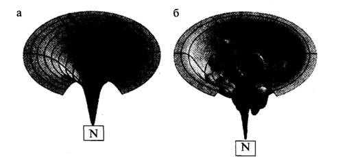Модельные исследования показали, что сворачивание белка происходит не случайно. Оно проходит через кинетически предпочтительные стадии, определяемые особенностями первичной структуры. У одних белков это проявляется в форме образования спиральных участков уже во время синтеза на рибосоме, у других — в форме объединения гидрофобных радикалов аминокислот и т.д. При этом формируется некое переходное состояние структуры белковой молекулы (их может быть несколько), из которого белок затем быстро переходит в нативную конформацию (рис. 1, б). Переход от исходной развернутой полипептидной цепи в нативное состояние можно изобразить в форме воронки (рис. 1, а)[1], расширенная часть которой демонстрирует существование множества возможных энергетических состояний, обеспечивающих взаимодействие отдельных участков исходной развернутой полипептидной цепи (верхняя часть воронки).