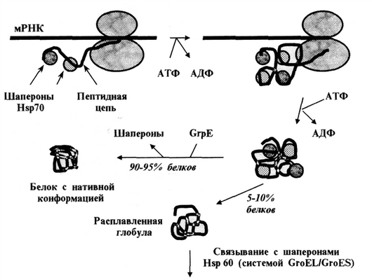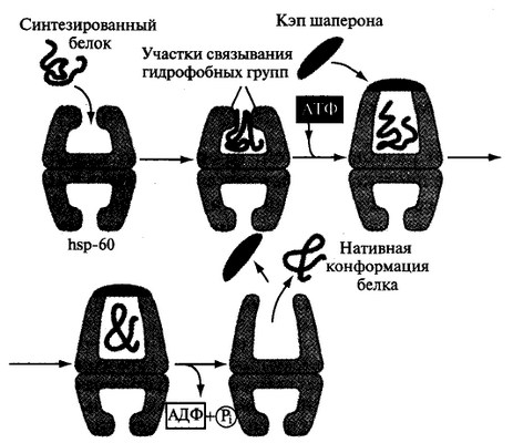 Выделяют два типа шаперонов — hsp60 и hsp70. Различия в их действии показаны на рис. 3, и рис. 4. Учитывая важную роль гидрофобных взаимодействий в формировании структуры белковой молекулы, на путь образования агрегатов легко могут встать белки, синтезируемые в водном окружении и экспонирующие гидрофобные группы. Шапероны, связывая участки, богатые неполярными группами, предотвращают агрегацию и, используя энергию гидролиза АТФ, способствуют преодолению энергетических барьеров на пути формирования нативной структуры белковой молекулы (см. рис. 2, 3, 4).