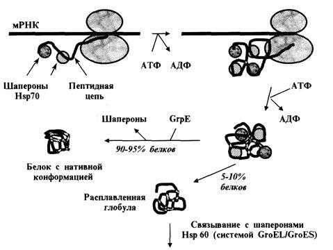 Более того, у Е. соli примерно 200-300 белков (составляющие 5-10 % от общего белкового пула) и после неоднократной «обработки» системой DпаК/DnaJ остаются в состоянии незавершенного фолдинга—в виде расплавленной глобулы.