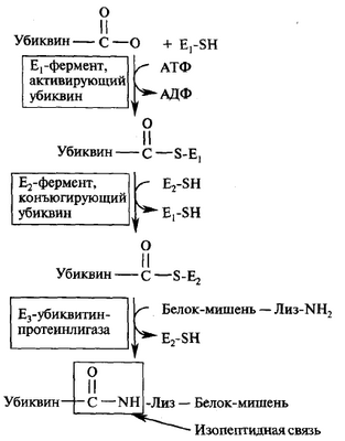 Роль «черной метки», которая присоединяется к белку, подлежащему протеолизу, выполняет специфический белок — убиквитин, состоящий из 76 аминокислот. Распознавание белка и присоединение убиквитина катализируется специальной системой, состоящей из трех ферментов (Е1 Е2 и Е3). Она высоко специфична и избирательна за счет того, что построена по принципу иерархического усложнения[3].