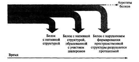 Некоторая часть синтезируемых молекул не достигает стадии формирования нативной структуры. Для этого случая Природа предусмотрела механизм узнавания таких молекул и их удаления путем протеолиза. Важное место в этом механизме отводится убиквитину и протеасомному протеолизу. Наблюдения показывают, что более трети всех синтезированных белков подвергается протеолизу протеасомами. Этим Природа пытается максимально обезопасить себя от повреждающего действия агрегатов белков, возникающих из неправильно уложенных в пространстве и функционально бесполезных молекул. Наиболее известным признаком неправильно уложенной структуры является появление на поверхности белковой молекулы участков, богатых гидрофобными группами. Чаще всего такие участки становятся объектом узнавания шаперонами, задачей которых является предупреждение агрегации и облегчение формирования нативной структуры. Если это не удается, белок подвергается протеолизу.