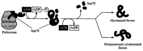 Система этих белков осуществляет, видимо, ко-трансляционный фолдинг (рис.1.8). Иначе говоря, они связываются с синтезирующимися полипептидными цепями еще до окончания трансляции — когда эти цепи еще находятся на рибосомах. Такое раннее связывание предупреждает «неправильные» взаимодействия внутри незавершенных пептидов и агрегацию цепей, высвобождающихся с рибосом.
