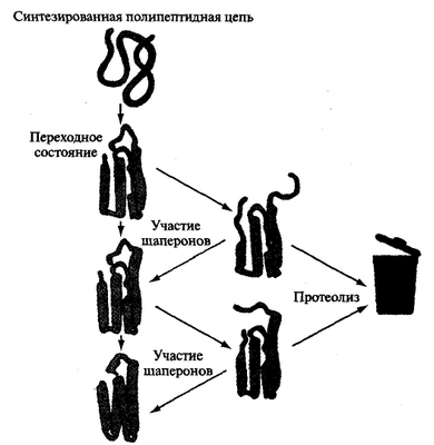 Процесс образования белков в клетке состоит из двух этапов: биосинтеза полипептидной цепи и образования нативного состояния, т. е. достижения полипептидной цепью состояния, в котором белок становится функционально активным. Первый этап — сборка аминокислотной последовательности на основе информации, хранящейся в DNA. Хотя этот процесс и является очень сложным, он хорошо изучен. Второй этап — формирование нативной структуры белка — изучен в значительно меньшей степени, и именно к нему в настоящее время приковано основное внимание исследователей.