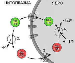 1. Транслокация Ran-ГТФ в цитоплазму в комплексе с транспортинами. 2. Гидролиз ГТФ. Собственная ГФАзная активность Ran активируется цитоплазматическим белком RanGAP. 3. Ran-ГДФ реимпортируется в ядро при участии белка NTF2. 4. ГДФ в активном центре Ran заменяется на ГТФ под действием ядерного белка RCC1 (фактора обмена нуклеотидов).