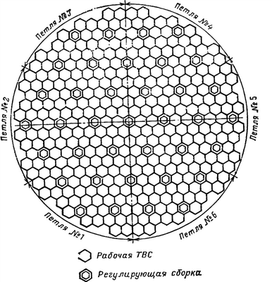 На рис. 6.4 показана картограмма размещения шестигранных ТВС по сечению активной зоны. Римскими цифрами указаны номера групп кластеров. Отсутствие римских цифр в периферийных ТВС свидетельствует о размещении в них выгорающих поглотителей. Среди ТВС с кластерами некоторые из них снабжены укороченными поглотителями, предназначенными для выравнивания поля по высоте активной зоны. На этом же рисунке показаны ТВС с нейтронными измерительными каналами, количество и размещение ионизационных камер за пределами активной зоны. Последние предназначены в качестве датчиков нейтронной мощности в различных диапазонах работы реактора.