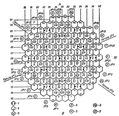 1 — ТВС с поглотителями СУЗ с половинной длиной наполнения поглощающих материалов; 2 — ТВС с нейтронными измерительными каналами; 3 — номер группы поглотителей СУЗ, указанной римской цифрой; 4—7 — ионизационные камеры энергетического, пускового, резервные пускового и промежуточного диапазонов