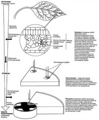 В растении роль шара 1, содержащего концентрированный раствор, выполняют фотосинтезирующие клетки, роль шара 2, содержащего разбавленный раствор, — клетки органа — акцептора ассимилятов. Их соединяют ситовидные трубки. Сахароза, образовавшаяся в результате фотосинтеза, активно накачивается в ситовидные трубки мелких проводящих пучков. Это уменьшает водный потенциал ситовидных трубок, и вода начинает в них поступать с помощью осмоса. В результате возникает гидростатическое (тургорное) давление, и раствор двигается к клеткам акцептора по градиенту давления. В органе-акцепторе сахароза активно расходуется, что вызывает повышение водного потенциала ситовидных трубок. Вода двигается из ситовидных трубок по градиенту водного потенциала и по ксилеме быстро возвращается к месту синтеза сахарозы (к листьям).