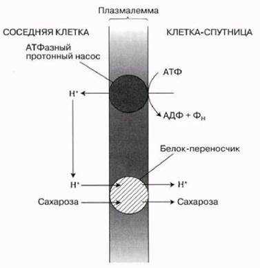 Рис. 13.28. Загрузка клетки-спутницы сахарозой. Ионы Н + (протоны) выкачиваются из этой клетки протонным насосом. Он находится в плазмалемме, требует для своей работы энергии АТФ и сам обладает АТФазной активностью. Протоны возвращаются в клетку по механизму облегченной диффузии: особый белок-переносчик пропускает их туда одновременно с молекулами сахарозы (симпорт).