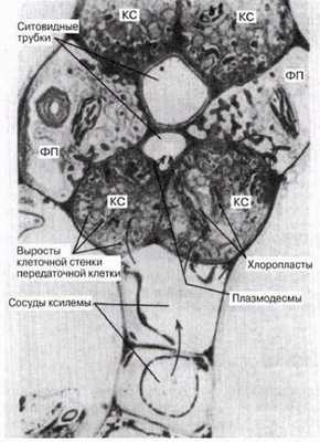Рис. 13.27, Поперечный срез мелкой жилки листа крестовника обыкновенного (Senecio vulgaris). Во флоэме (верхняя половина снимка) видны шесть Ю1еток, окружающих две ситовидные трубки. Это четыре клетки-спутницы (КС) с плотной цитоплазмой, преобразованные в передаточные клетки, и две клетки флоэмной паренхимы (ФП) с более прозрачной цитоплазмой и выростами клеточной стенки только со стороны, прилегающей к ситовидным трубкам. Последние обычно соединены с клетками-спутницами плазмодесмами, а флоэмная паренхима образует симпластную связь с проводящими элементами очень редко. В нижней части снимка посередине видны два ксилемных сосуда, а по бокам от них — две крупные клетки обкладки проводящего пучка. Стрелки указывают возможные пути движения растворенных веществ в ситовидные трубки, включая апопластный транспорт некоторых компонентов ксилемного сока. Увеличение в 6560 раз.