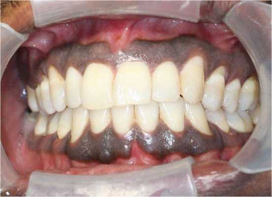 Мужчина, 42 года, обратился к врачу с жалобами на тёмные участки дёсен в области фронтальной группы зубов нижней челюсти. Пигментация наблюдалась с вестибулярной и язычной сторон в области резцов и клыка, а также в области 46 зуба (см. фото). Повышенная пигментация не была связана с какими-либо другими симптомами, пациент жаловался лишь на эстетический дефект. Два года назад заметил два небольших участка гиперпигментации, с тех пор участки увеличились в размерах. Пациент отрицал курение, употребление жевательного табака и алкоголя, семейный анамнез по данному заболеванию отсутствовал. При пальпации образование не было твёрдым, лимфоузлы не пальпировались. Анализ крови был в норме, на рентгенограмме не было никаких значительных изменений. Инцизионная биопсия помогла поставить диагноз «меланома полости рта». Пациент был направлен в ЧЛХ, терапия была начата немедленно, но в связи с высокой степенью злокачественности пациент скончался спустя 4 месяца после её начала.