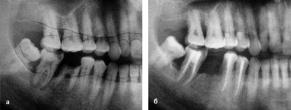 Рис. 3. а - ЭПП в области зуба 47; б - восстановление костной ткани в периапикальной области зуба 47 и стабилизация уровня костной ткани альвеолярного отростка после проведенного лечения.