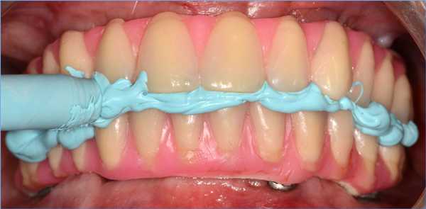 Методика: Пациент смыкает зубы в положении центральной окклюзии. С помощью шприца- пистолета выдавливают пасту в межзубные промежутки по окклюзионной поверхности зубов, начиная с дистальных отделов. После затвердения пасты просят пациента открыть рот и вынимают силиконовый шаблон.