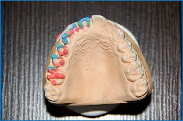 2. Между опорными коронками и антагонистами получается слой гипса, и если техник будет моделировать промежуточную часть в таком гипсовом окклюдаторе, то она будет превышать прикус, и приходится в клинике спиливать жевательную поверхность искусственных зубов, что приводит к нарушению жевательной поверхности (бугров), и такой протез не будет полноценным.