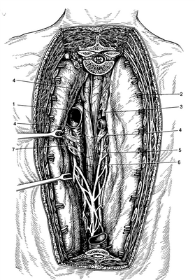 1 аорта: 2 межреберные сосуды; 3—непарная вена; 4—клетчатка средостения; 5—правый блуждающий нерв: б—пищевод; 7- левый блуждающий нерв.