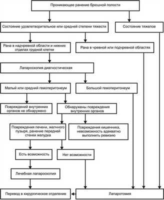 Наш алгоритм состоит из последовательных тактических мероприятий, которые можно сформулировать следующим образом: при поступлении пострадавшего в приемное отделение с наличием раны на брюшной стенке обязательно выполняли первичную хирургическую обработку раны в условиях малой операционной или реанимационного зала, в зависимости от тяжести состояния пациента, с целью установления проникающего характера ранения. При тяжелом состоянии пациента, вызванном, как правило, геморрагическим шоком, а также при локализации раны в чревной и подчревной области пациенту выполняли экстренное хирургическое вмешательство — лапаротомию. При состоянии удовлетворительном или средней тяжести и расположении раны в нижних отделах грудной клетки и чревной области выполняли диагностическую лапароскопию и в зависимости от обнаружения характера повреждений и возможности их коррекции эндовидеохирургическими способами лапароскопию переводили в лечебную, а при невозможности выполняли лапаротомию.