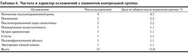 Осложнения от данных видов хирургического лечения и диагностики встретились в 2 группах с различной частотой. В контрольной группе послеоперационные осложнения были у 9 (9,68%) пострадавших. Причем у одного пациента имелось 5 осложнений. Вид осложнений и их частота приведены в табл. 6. Чаще всего наблюдалось нагноение послеоперационной раны — у 4 (4,3%) пострадавших.