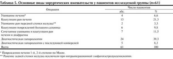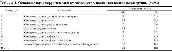 В табл. 4 представлены основные виды хирургических вмешательств у пациентов контрольной группы. У 37 (39,8%) пациентов повреждения внутренних органов отсутствовали. Следовательно, хирургическое вмешательство было выполнено необоснованно. У 32 (34,4%) пациентов обнаружены изолированные повреждения печени, большинство из которых также можно было устранить эндоскопическим методом.