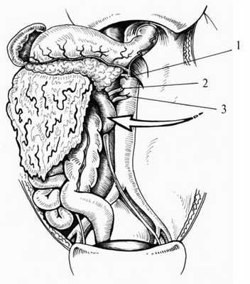 Рис. 1. Схема левостороннего доступа. 1 — чревный ствол, 2 — верхняя брыжеечная артерия, 3 — левая почечная артерия. Стрелка — направление смещения органов.