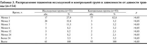 Распределение пациентов по давности травмы представлено в табл. 3. Большинство пострадавших поступили в приемное отделение больницы не позднее чем через 6 ч с момента ранения. Согласно данным табл. 1—3, достоверных различий по возрасту, половому составу, а также срокам госпитализации пострадавших в исследуемой и контрольной группах нет (р>0,05).