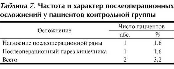 Характер и частота осложнений у пациентов исследуемой группы приведены в табл. 7. Кроме приведенных осложнений у пациентов исследуемой группы во время лечебно-диагностической видеолапароскопии отмечались подкожная эмфизема — у 2 больных (с ожирением II—III степени), синдром «иглы Вериша» — у 2, эмфизема большого сальника — у 3, которые являются специфическими осложнениями при проведении видеолапароскопии. Они не влияли на ход операции и на течение послеоперационного периода. Послеоперационный парез кишечника удалось разрешить консервативно. Причиной же нагноения послеоперационной раны (троакарной в пупочном кольце), вероятнее всего, стала нагноившаяся гематома раны в связи с неудовлетворительным интраоперационным гемостазом в данной области. Летальных случаев не было.