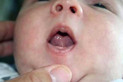 У новорожденных патология уздечки выявляется во ходе кормлений. Детки с этой проблемой плохо сосут молоко, быстро устают, часто прикладываются к груди, но бросают ее и плачут. Когда малыш сосет, мама может увидеть, что половина молока выливается, а также услышать цокающий звук. Неразвитость языка, а также неприятные ощущения при приеме пищи являются следствием того, что малыши с анкилоглоссией почти не набирают ни в весе, ни в росте. Детки на искусственном вскармливании испытывают те же самые трудности.