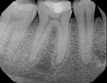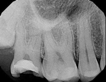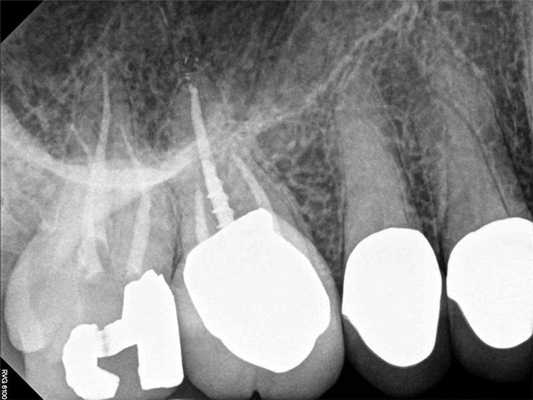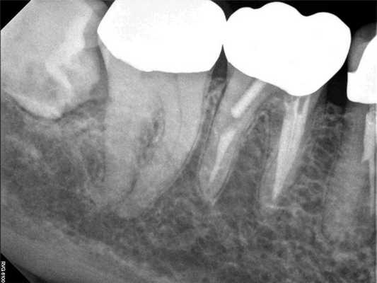 35-летний мужчина обратился за стоматологической помощью по причине сильной боли с правой стороны челюсти и лица. Он не мог самостоятельно четко определить источник боли, но ее интенсивность возрастала на протяжении последних нескольких дней. Сначала пациент чувствовал, что боль распространяется с области нижней челюсти, но за последние 24 часа боли иррадиировала и в проекцию верхней челюсти. Из-за болевых ощущений он практически не спал, а 220 мг принятого им напроксена лишь незначительно снизили интенсивность болевых ощущений. По данным анамнеза удалось установить факт реставрации зубов 2 и 30 в период последних 10 лет. В ходе клинического осмотра были верифицированы признаки микроподтекания вокруг огромной композитной реставрации на окклюзионной поверхности зуба 2. Вторичный кариес был идентифицирован на щечной стороне 30 зуба в области интерфейса соединения реставрации с твердыми тканями. Зуб 1 в ротовой полости не визуализировался. И зуб 30, и зуб 2 не реагировали на провокационные тесты, в то время как соседние зубы демонстрировали нормальную чувствительность к воздействию факторов холода и в ходе проведения электроодонтометрии. На перкуссию и пальпацию все дистальные зубы на верхней и нижней челюсти реагировали нормально, также не было обнаружено признаков отека, свищевого хода или пародонтальных дефектов. На периапикальной рентгенограмме были визуализированы признаки предварительного выполнения пульпотомии зуба 2, без наличия симптомов смежного апикального поражения (фото 5).