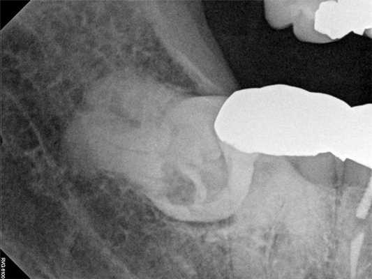 Фото 4. Клинический случай 1. После выполнения анестезиологической блокады было проведенного повторное рентгенологическое обследование, которое позволило обнаружить внутрикорональную резорбцию в структуре ретинированного моляра, которая спровоцировала развитие симптомов необратимого пульпита.
