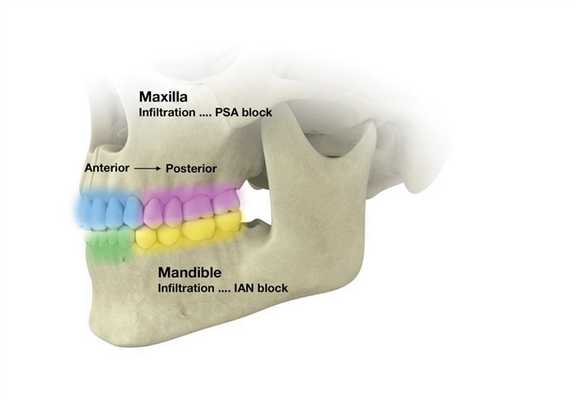 Блокада нижнего альвеолярного нерва, наиболее распространенная блокада зубного нерва, обезболивает ипсилатеральную часть нижней челюсти (включая зубы и кости), а также латеральную (буккальную) часть слизистой оболочки над нижними резцами, клыками и первым премоляром, и, на коже, ипсилатерально к нижней губе и подбородку.