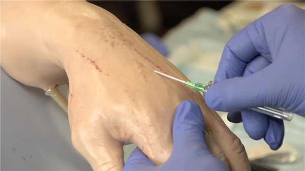 Недоминирующей рукой удерживайте область неподвижной и, мягко потяните вену дистальнее места введения иглы, используя большой палец, чтобы предотвратить ее движение. При больших венах предплечья или локтевой ямки, тракция не требуется.