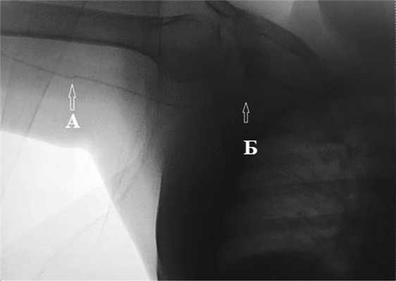 В стационаре при осмотре в месте выхода катетера не было признаков локального воспаления, отсутствовали признаки инфекции кровотока. При проверке работоспособности катетера выявлена его дисфункция: инфузия через катетер происходила, однако аспирация крови была невозможна, что позволило заподозрить формирование клапана на дистальном отверстии катетера. Выполнена рентгенография, при которой выявлена дислокация дистального конца катетера, который обнаружен в подключичной вене (рис. 1). Рис. 1. Изгиб катетера на уровне верхней трети плеча (А), дистальный конец ПИЦВК в подключичной вене (Б).