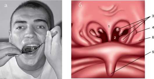 А - положение носоглоточного зеркала; б - картина носоглотки при задней риноскопии: 1 - сошник; 2 - хоаны; 3 - задние концы нижней, средней и верхней носовых раковин; 4 - глоточное отверстие слуховой трубы; 5 - язычок; 6 - трубный валик
