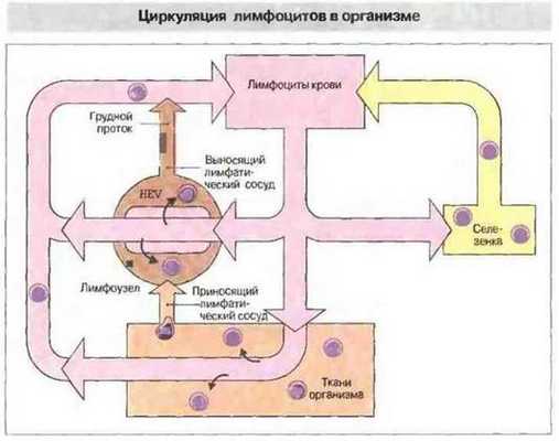 Миграция лимфоцитов из первичных во вторичные лимфоидные ткани уже описана выше. Оказавшись во вторичных лимфоидных органах и образованиях, многие лимфоциты не остаются в них, а перемещаются из одного лимфоидного органа в другой по кровеносным и лимфатическим сосудам (рис. 3.25).