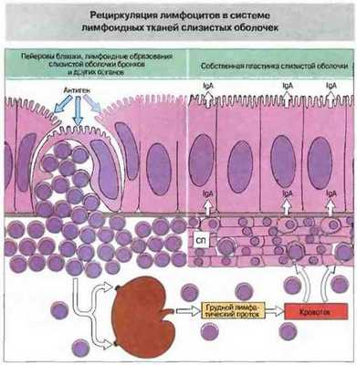 Рис. 3.28. Лимфоидные клетки, активированные антигеном в пейеровых бляшках (или в лимфоидных образованиях, ассоциированных с бронхами и другими слизистыми оболочками) через регионарные лимфоузлы и затем по грудному протоку мигрируют в кровяное русло, из которого вновь возвращаются в собственную пластинку (СП) эпителия кишечника и других слизистых оболочек, вблизи места антигенного примирования или на значительном удалении от него. Таким образом лимфоциты, стимулированные на слизистой оболочке в одной из частей тела, могут избирательно распределяться по системе ЛТС. Избирательность расселения достигается благодаря экспрессии особых молекул межклеточной адгезии на лимфоцитах и на клетках ВЭВ слизистых оболочек.
