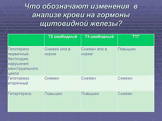 | Т3 общий | избыточная функция щитовидной железы; гепатит; беременность; СПИД; порфирия. | гипотиреоз; голодание; гемолиз; заболевания ЖКТ, почек и печени. |
