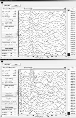 Критичные изменения МВП (при этом одновременно снижались амплитуды ССВП с последующим восстановлением либо без него) отмечены в 7 случаях, после операции у этих пациентов развился либо усилился неврологический дефицит. В остальных случаях совместного применения ССВП и МВП их параметры оставались стабильными (см. рис. 1, а, б), послеоперационных неврологических осложнений не было. Благодаря идентификации лицевого нерва (см. рис. 1, в) и мониторингу АСВП (рис. 2) у 20 пациентов из 27 удалось сохранить проводимость по лицевому и слуховому нервам.