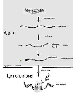 Известно, что матричная РНК (мРНК) является главным посредником между ДНК и белок-синтезирующим аппаратом. У прокариотических организмов только что транскрибированная мРНК функционально активна и начинает транслироваться немедленно. У эукариот же после транскрипции пре-мРНК подвергается созреванию. Только правильно созревшая мРНК транспортируется из ядра в цитоплазму и служит матрицей для синтеза белка.